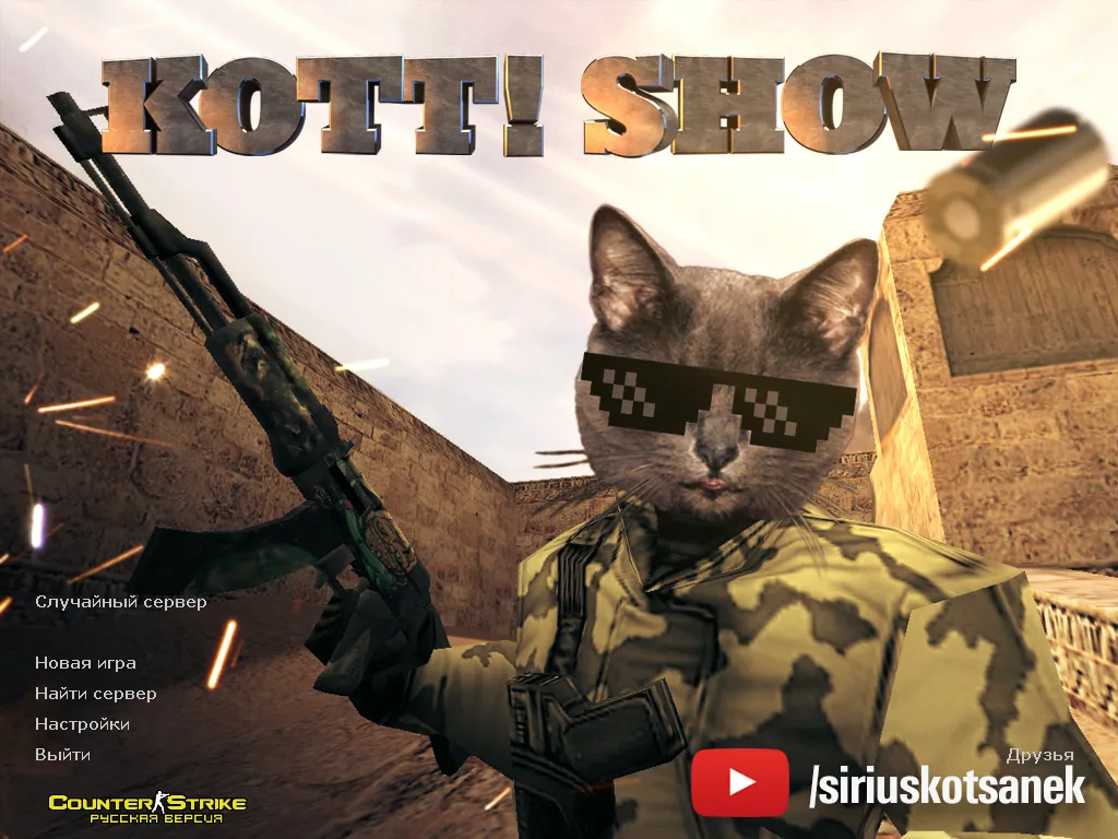 Разработчик Kott прекрасно знает что нужно игрокам для получения удовольствия от игры в КС 1.6. Убедиться в этом можно, посмотрев несколько роликов на его канале. А что это? На экране с оружием в руках не спецназовец или террорист, а самый натуральный кот! Он умело обращается с автоматом Калашникова, винтовкой и гранатами. Кстати, в кошачьей теме оформлено и меню. Тут располагается изображение кота, полностью одетого в боевой камуфляж.